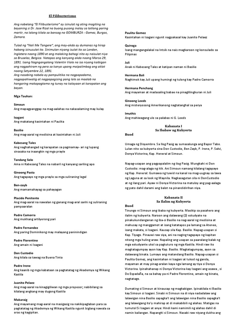 Start studying El Fili Kab 23. Tulad ng Noli Me Tangere si Rizal ay dumanas ng hirap habang isinusulat ito. Sinasabing ang Kapitan Heneral daw ay manonood ng palabas na maaaring bunga ng dalawang dahilan.