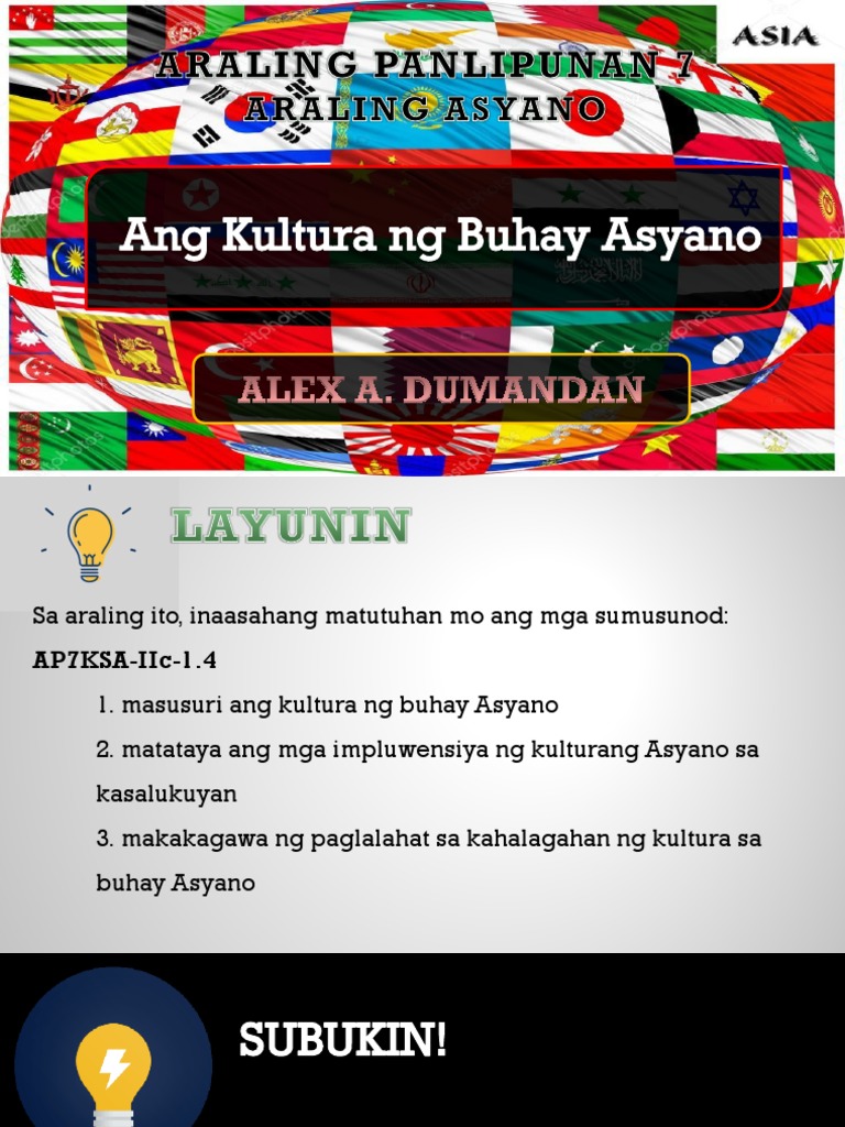 1 Tungkol Saan ang Modyul na Ito. Ang proyektong ito ay ginawa upang magbalik tanaw sa mga pamana ng sinaunang Asyano sa daigdig. Ang kultura ng Asya ay ang kabihasnan ng tao sa AsyaTinatampok nito ang ibat ibang mga uri ng pamanang pangkultura ng maraming mga kabansaan mga lipunan at mga pangkat etniko ng rehiyon na nakaugaliang tinatawag bilang isang kontinente magmula sa pananaw na Kanluranin hinggil sa Asya.