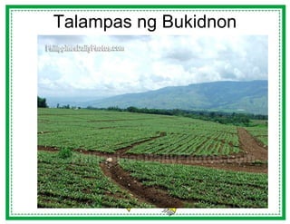 Ang mga lalawigan ng Bukidnon sa Mindanao at Agusan ay mga talampas. Bukidnon Bukid o bundok sa wikang Filipino. Halimbawa ng mga talampas sa pilipinas.