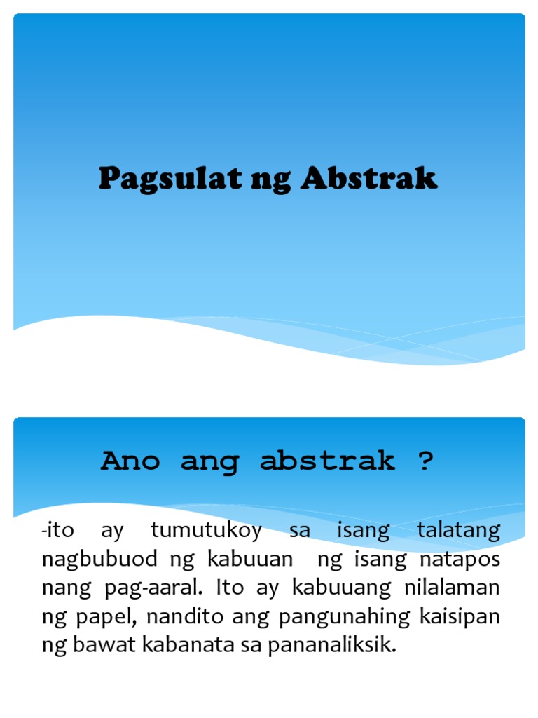 Hanapin at isulat ang mga pangunahing kaisipan o ideya ng bawat bahagi ng sulatin mula sa introduksyon kaugnay na literature metodolohiya resulta at konklusyon. Bakit mahalaga ang abstrak sa isang pananaliksik o pag-aaral. Ito ang siksik na bersiyon ng mismong papel.